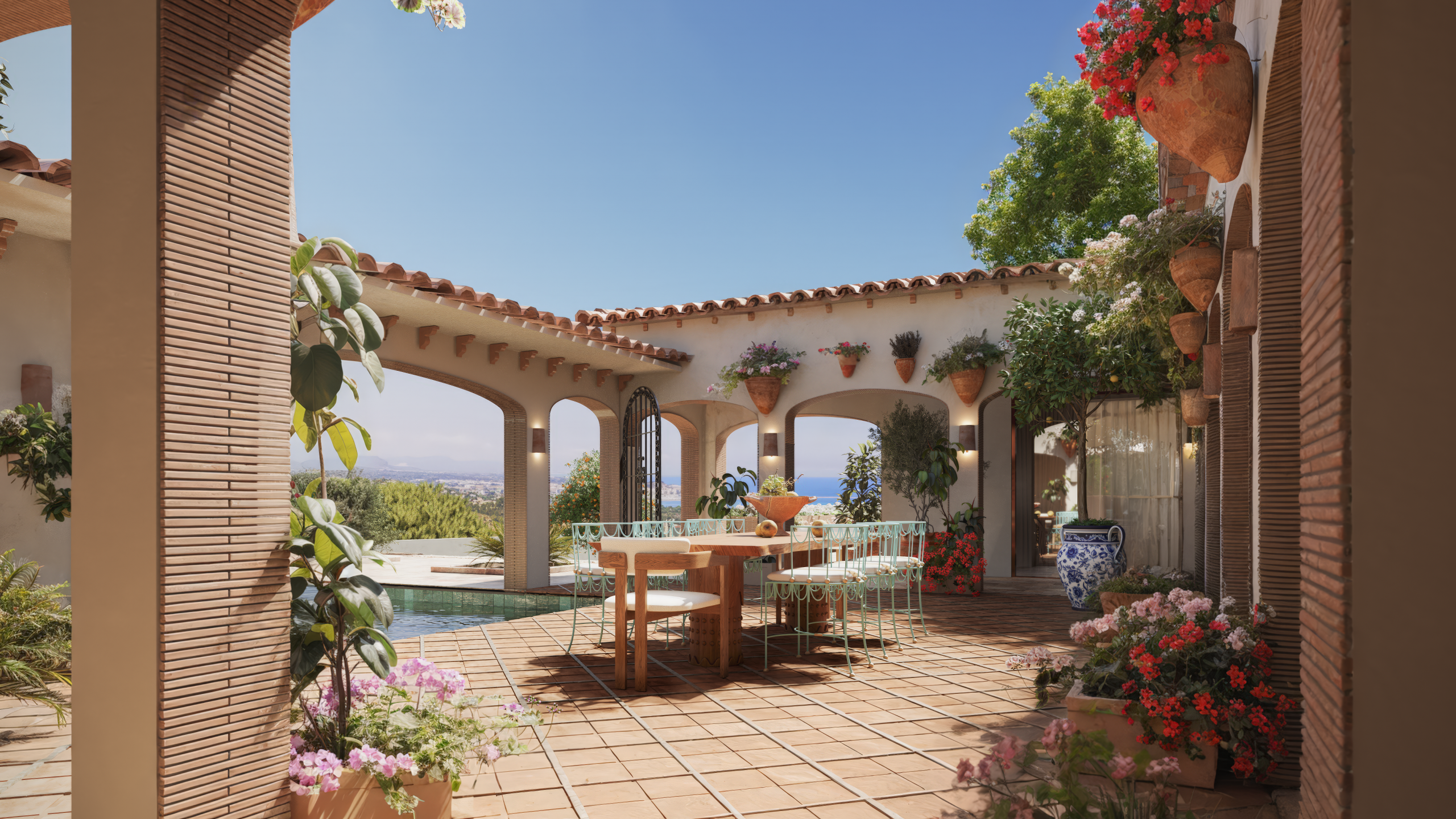 El alma de la casa gira en torno a un patio andaluz central, con una naya de arcos redondeados, macetas de terracota en la fachada, y una piscina orientada al sur que disfruta del sol durante todo el día. Este corazón exterior se abre al jardín mediterráneo, diseñado para ofrecer distintos espacios de vida: cocina de verano, jacuzzi, terrazas íntimas, rincones de sombra y de calma, todo bañado de luz y rodeado de naturaleza.