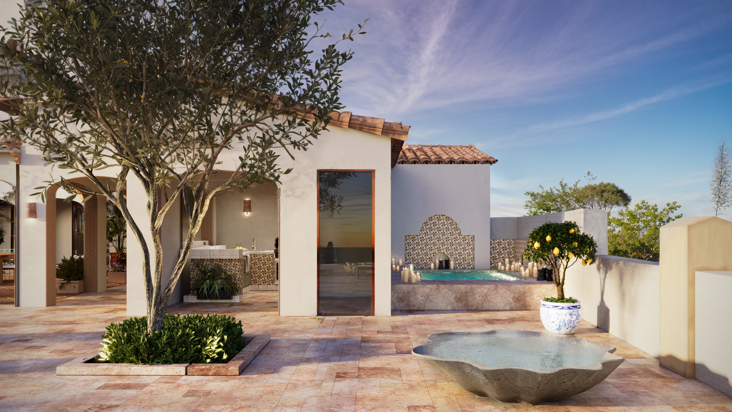 Inspirada en la arquitectura andaluza, Villa Siri toma forma a través de materiales nobles y naturales: suelos de mármol travertino, cerámicas hidráulicas, elementos decorativos en barro cocido artesanal, forja trabajada a mano y carpintería panorámica Technal acabado óxido. Nada es estándar. Todo ha sido diseñado a medida.